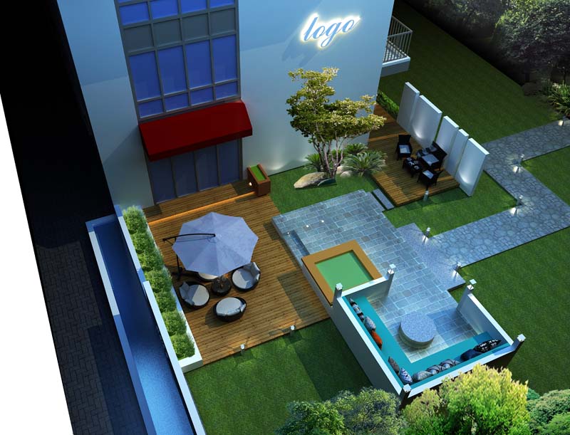先從外觀布局講起:采用“露營”式野趣為設(shè)計主調(diào),純白色外墻立面,搭配發(fā)光字體品牌LOGO,在黑夜中熠熠生輝;暗紅色雨棚設(shè)計,與青翠綠色草地在顏色上形成鮮明對比;花崗巖碎石地磚鋪就一條草間小路,連接起分布在外院不同角落的休息洽談區(qū)域,形成“散而不亂”的空間布局效果。