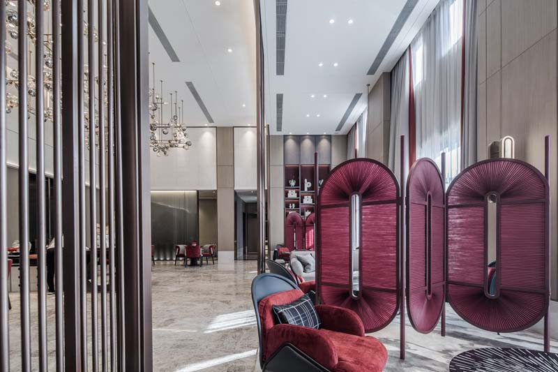 為了更好的提升整體檔次,為進(jìn)店業(yè)主營(yíng)造更多的舒適感與信任感,從而起到銷售中的促進(jìn)作用。設(shè)計(jì)師將精致軟裝設(shè)計(jì)發(fā)揮到極致:自帶藝術(shù)造型感根雕、紅與黑的布藝靠背沙發(fā)、及頂木質(zhì)書架展示柜……帶來(lái)的不止有美觀的視覺效果,更能讓業(yè)主真切的感受到舒適自在的家庭氛圍,從而促進(jìn)購(gòu)買決心。